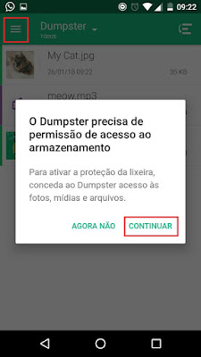 3. A partir desse momento, todos os arquivos deletados vão para a lixeira, podendo ser recuperados mais tarde. Caso queira realizar a recuperação do arquivo excluído, é necessário escolher o arquivo e depois clicar no botão “restaurar”. No meu exemplo, apareceu um erro de restauração, pois o arquivo excluído era do cartão de memória. Para continuar a restauração, basta escolher um outro local ou clicar OK para salvar na pasta Dumpster.